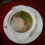 Stattdessen versuchten wir uns einen möglichst breiten Eindruck der chinesischen Küche abseits von “Huhn süß-sauer”, Glückskeksen und 11a mit Tofu zu verschaffen. Zu Vorspeise gab es ein paar Teigtaschen mit manigfaltiger Füllung, die so genannten Dim Sums. Danach verweigerten meine Begleiter das gemeinsame Mahl des Rinderpansens oder der Schweineohrensülze und so entschieden wir uns letztlich für eine kleine Portion Abalonensuppe (mit Tiefseemuschelfleisch) – also genau die Suppe, die in der großen Portion 88 EUR gekostet hätte -, Wasserspinat und Gong-Bao-Huhn. Begleitet wurde das ganze diesmal zwar nicht mit Great-Wall-Wein, aber immerhin gab es das gute Tsing-Tao-Bier. Für das leibliche Wohl der chinesischen Diplomaten ist auf jeden Fall bestens gesorgt.